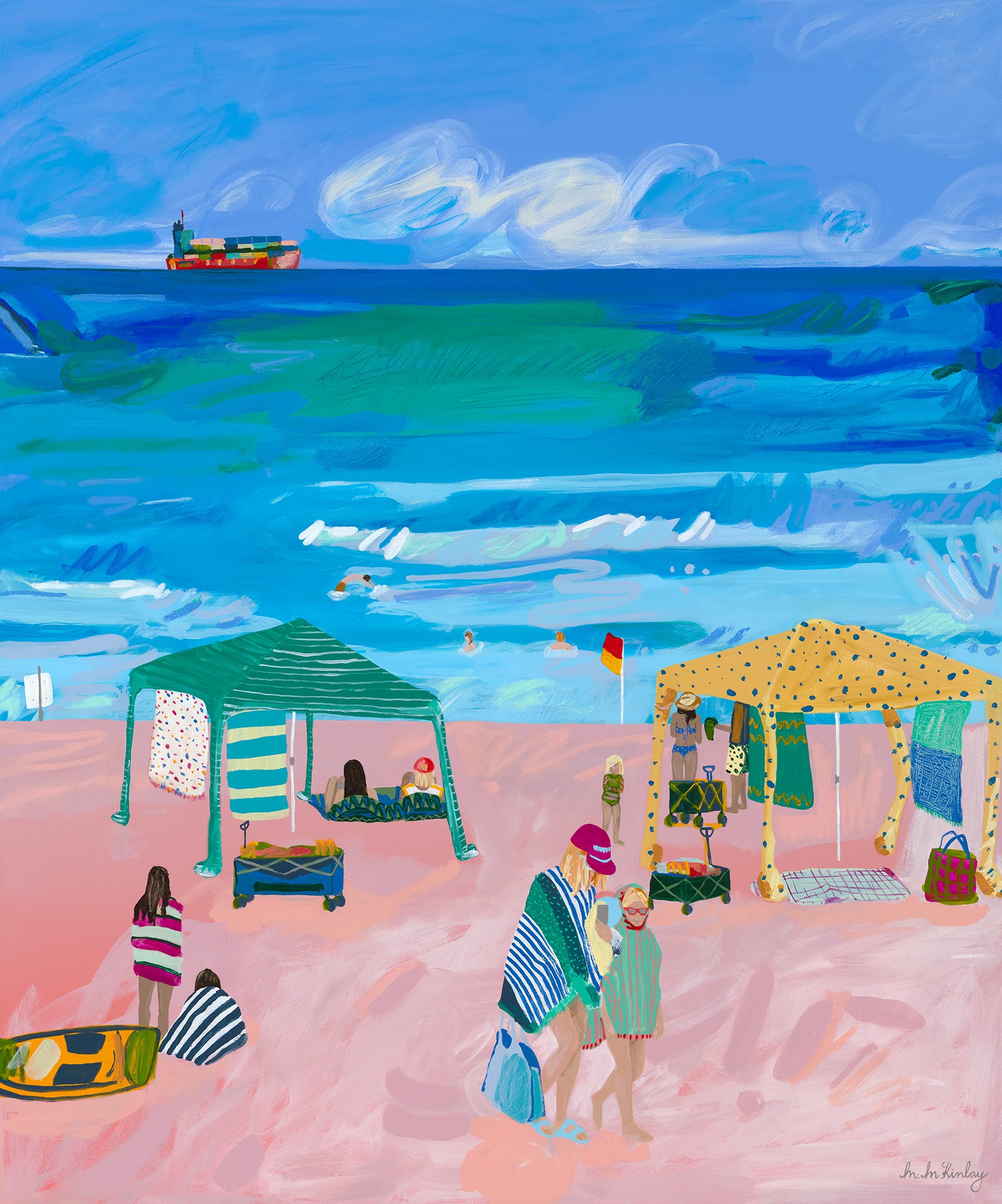 Bold beach style - striped and spotted cabanas pop against pink sand as swimmers bob in the surf.